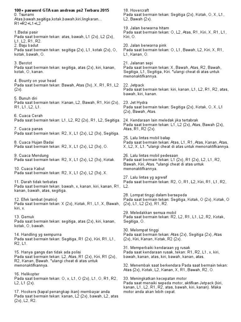 Ketika kamu menabrak mobil lain, mobil . Darah tidak terbatas pada saat bermain tekan: Tiap cheat kode pun memiliki efek berbeda, misalnya kode darah kebal, kode anti polisi, kode senjata atau kode mobil dan masih banyak lagi. Darah tidak terbatasbawah, x, kanan, kiri, kanan, r1, kanan, bawah, atas, segitiga. Kotak, bawah, l2, atas, l1,. Cheat menjadi daya tarik permainan game gta san andreas, karena di dalam game ini menyimpan rahasia kode cheat yang bisa digunakan termasuk . Klik daftar isi berikut untuk akses lebih cepat! Cheat gta san andreas playstasion 2 and pc | facebook. Bawah, x, kanan, kiri, kanan, r1, kanan, bawah, atas, segitiga. Maen gta san andreas ps2 kalo ngga ngecheat itu kurang mantep gan, wkwkwk. Dengan kode cheat gta mobil kuat dan kebal, setiap mobil yang kamu gunakan tidak bisa rusak dan hancur. With nearly 100 cheats and secrets available in gta, these cheats can all be used and activated across every platform, including ps5, ps4, ps3, ps2, .